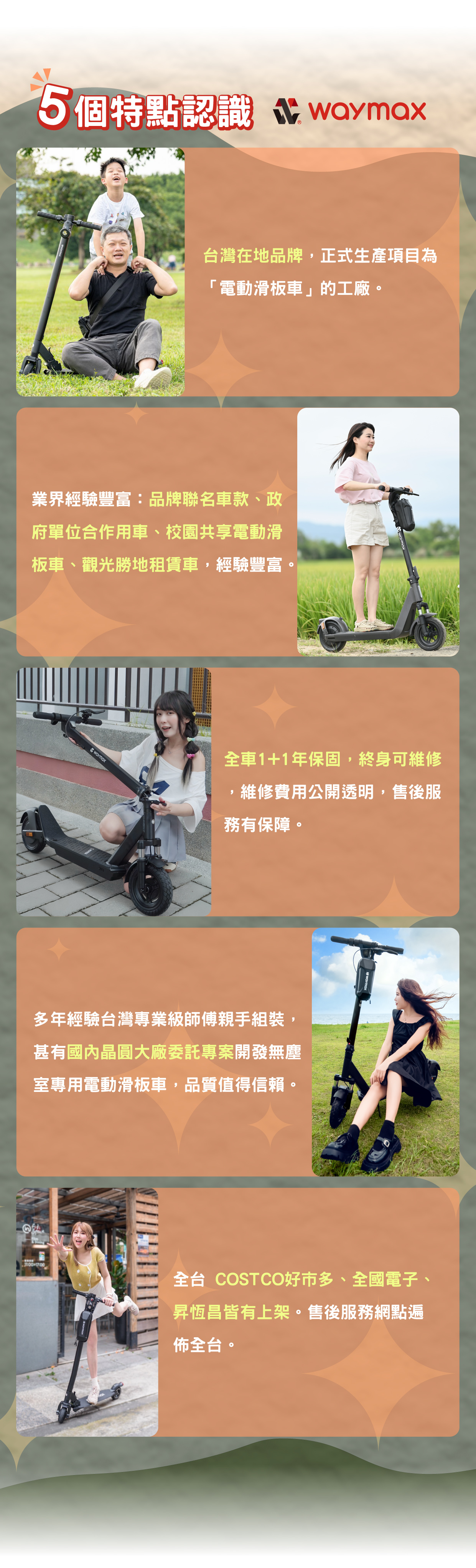 Waymax為台灣電動滑板車領導品牌。擁有首屈一指專業的電動滑板車工廠專業的檢測設備,從產品定位規劃、生產組裝、檢驗、包裝,皆由自廠多年經驗台灣專業技師與優質行銷團隊完成。