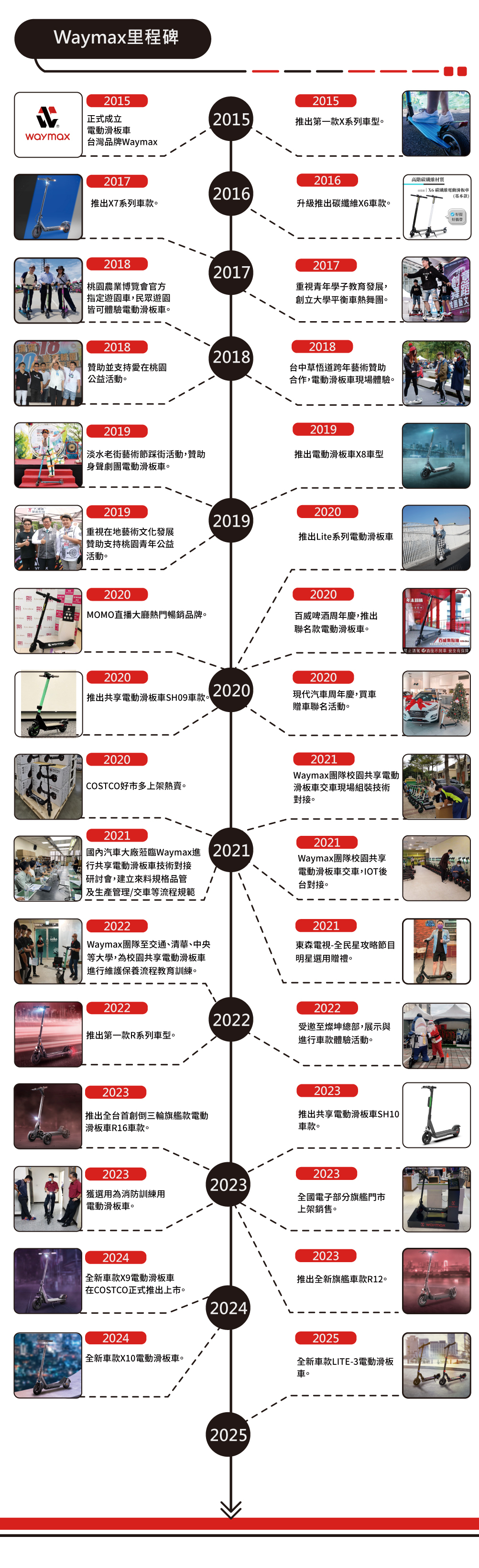 電Waymax響應綠色製造,重視綠能運具科技的推動,與各界攜手合作,為台灣的電動滑板車產業的發展不遺餘力。盼一同改變人們的生活休閒方式,創造騎行新生活。