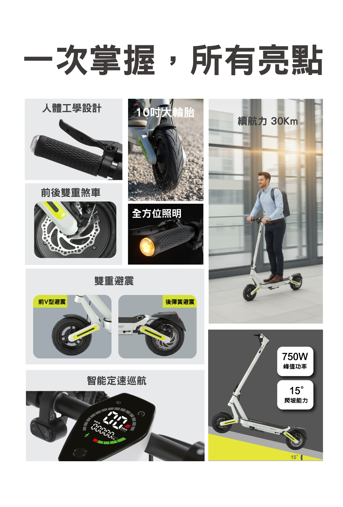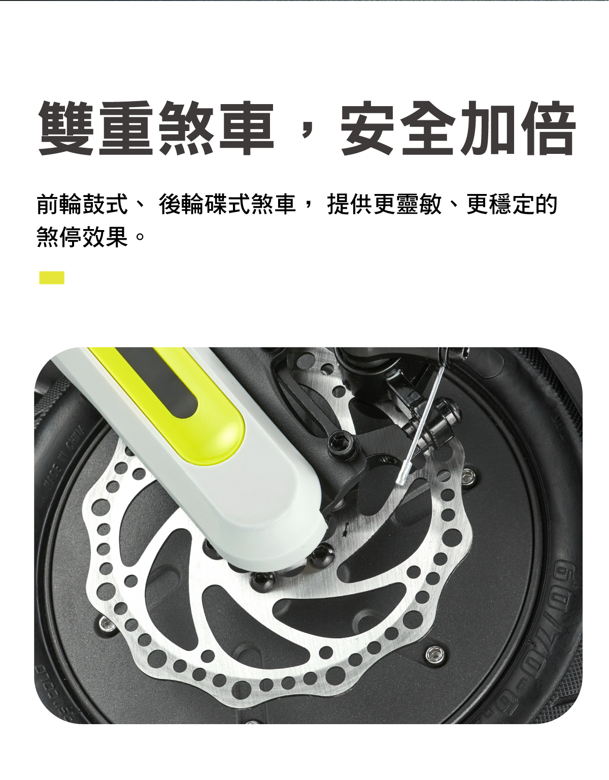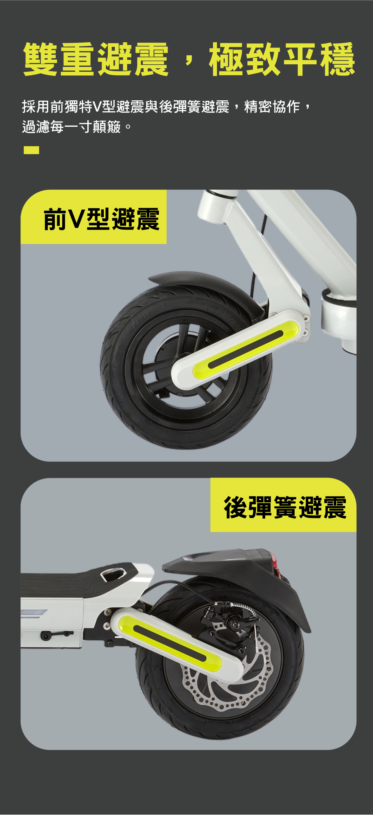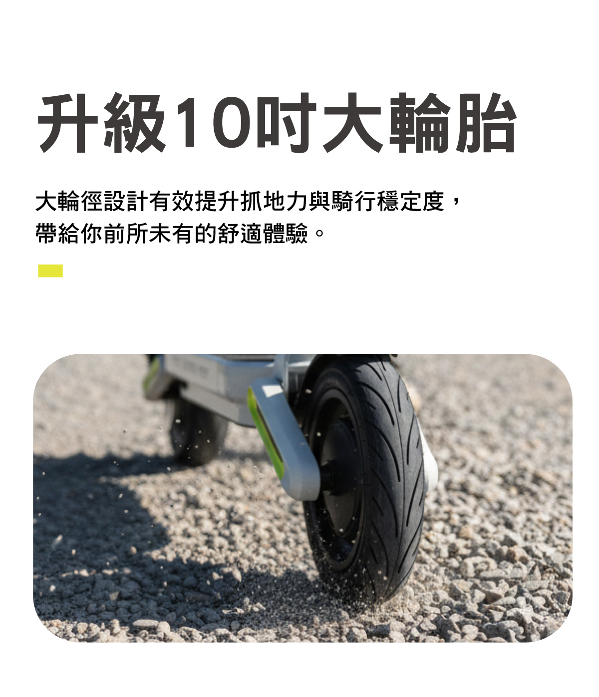 配備前後雙避震系統和 10 吋大輪胎,提供極致舒適路感。
