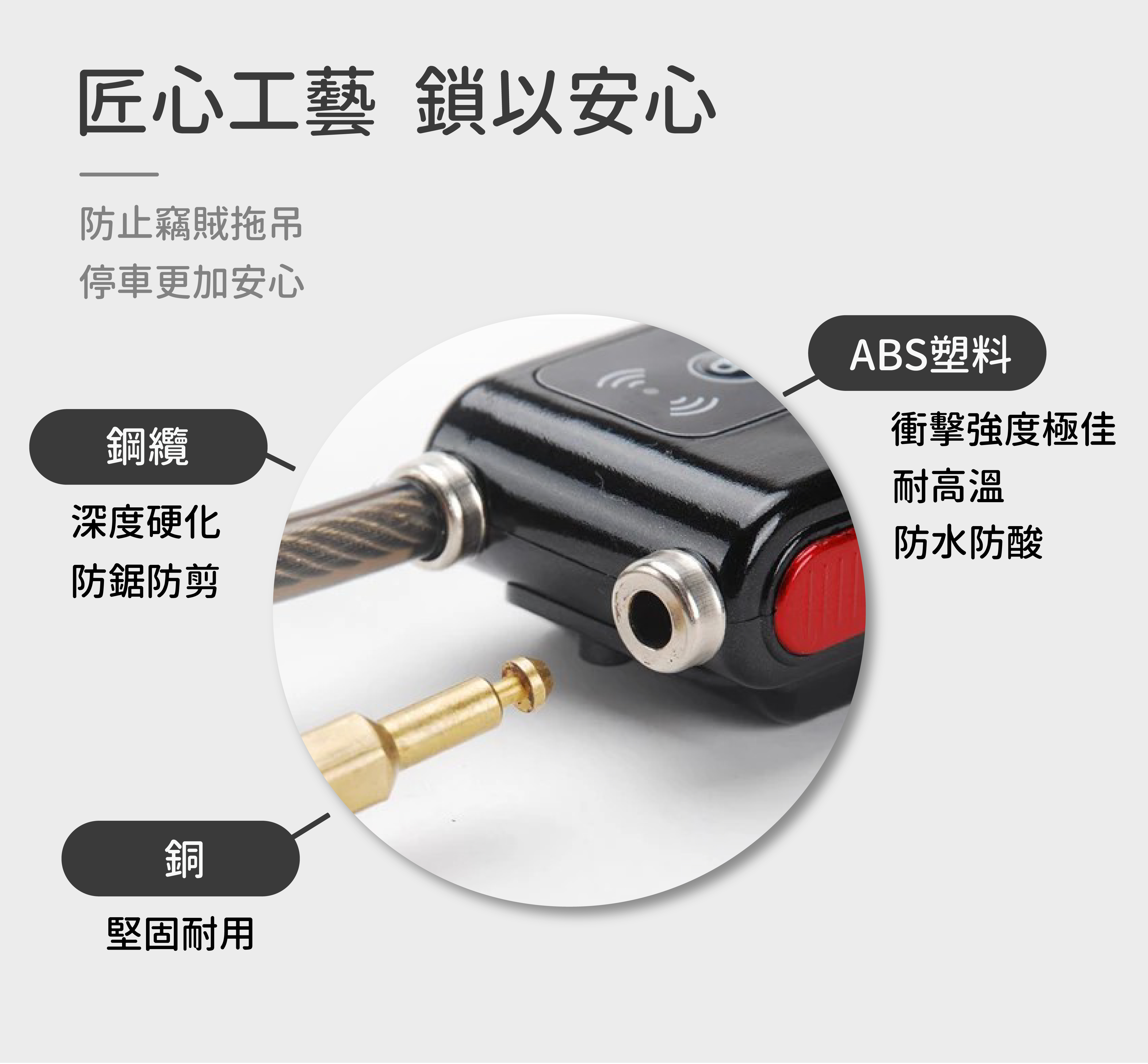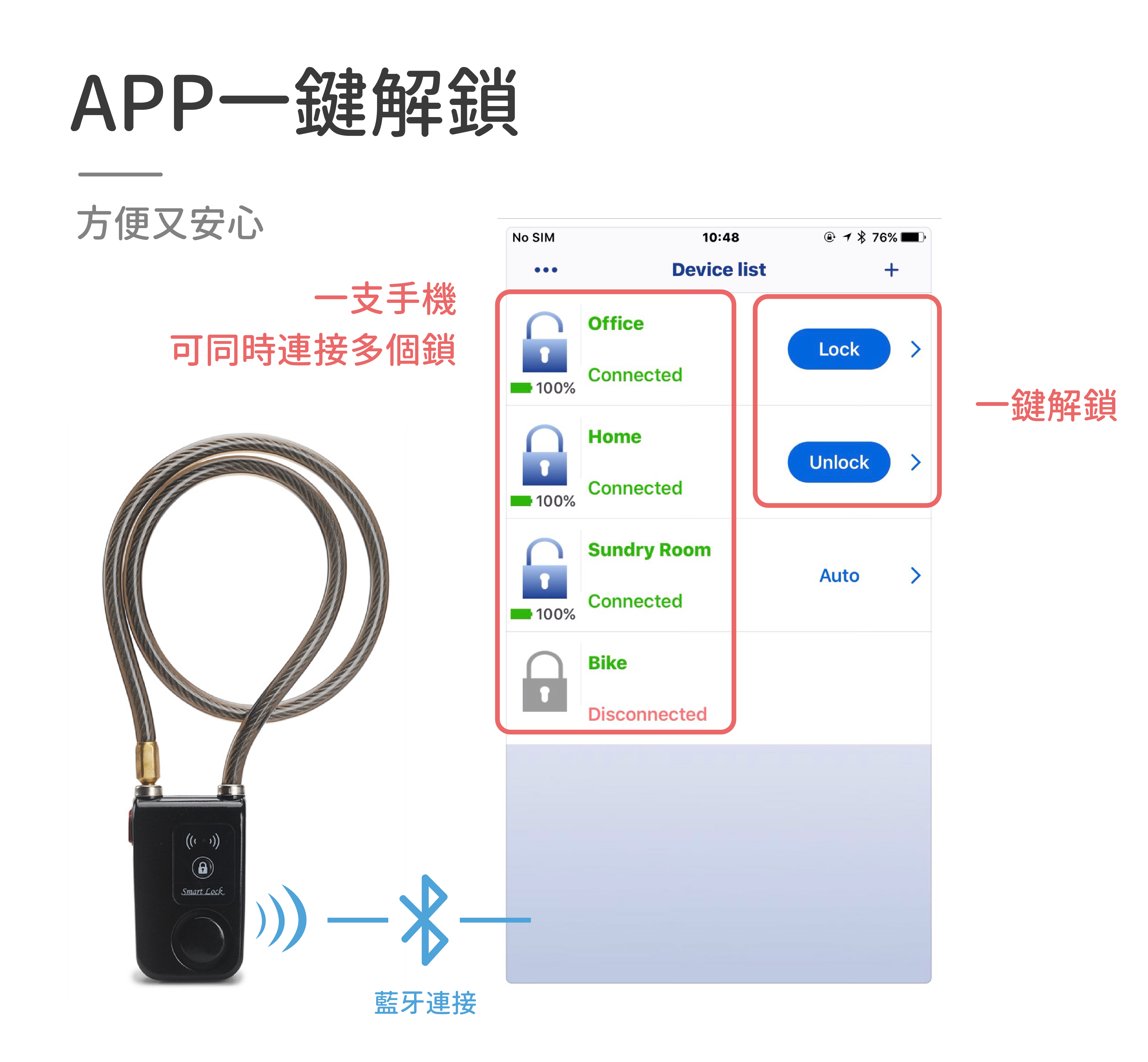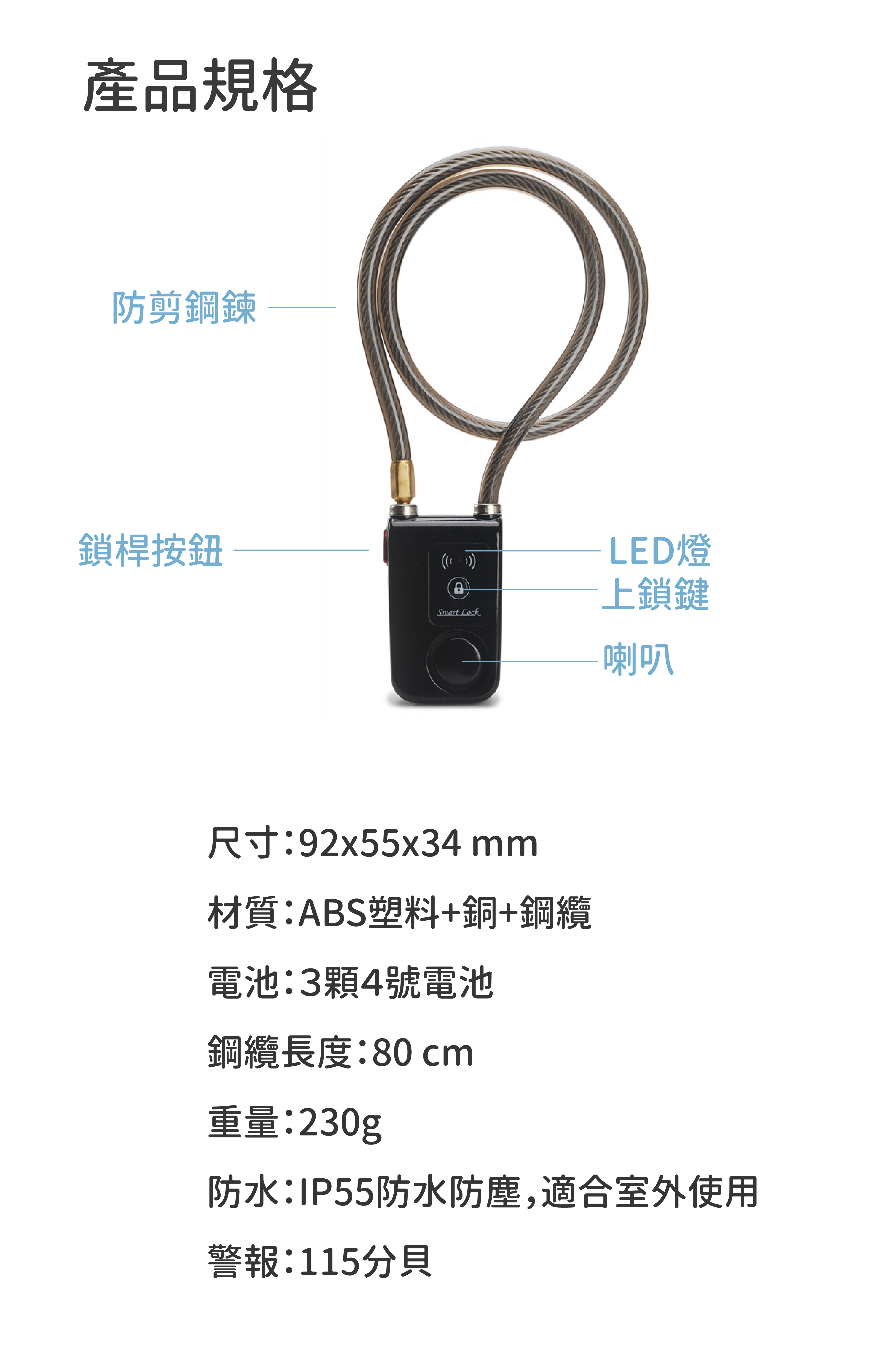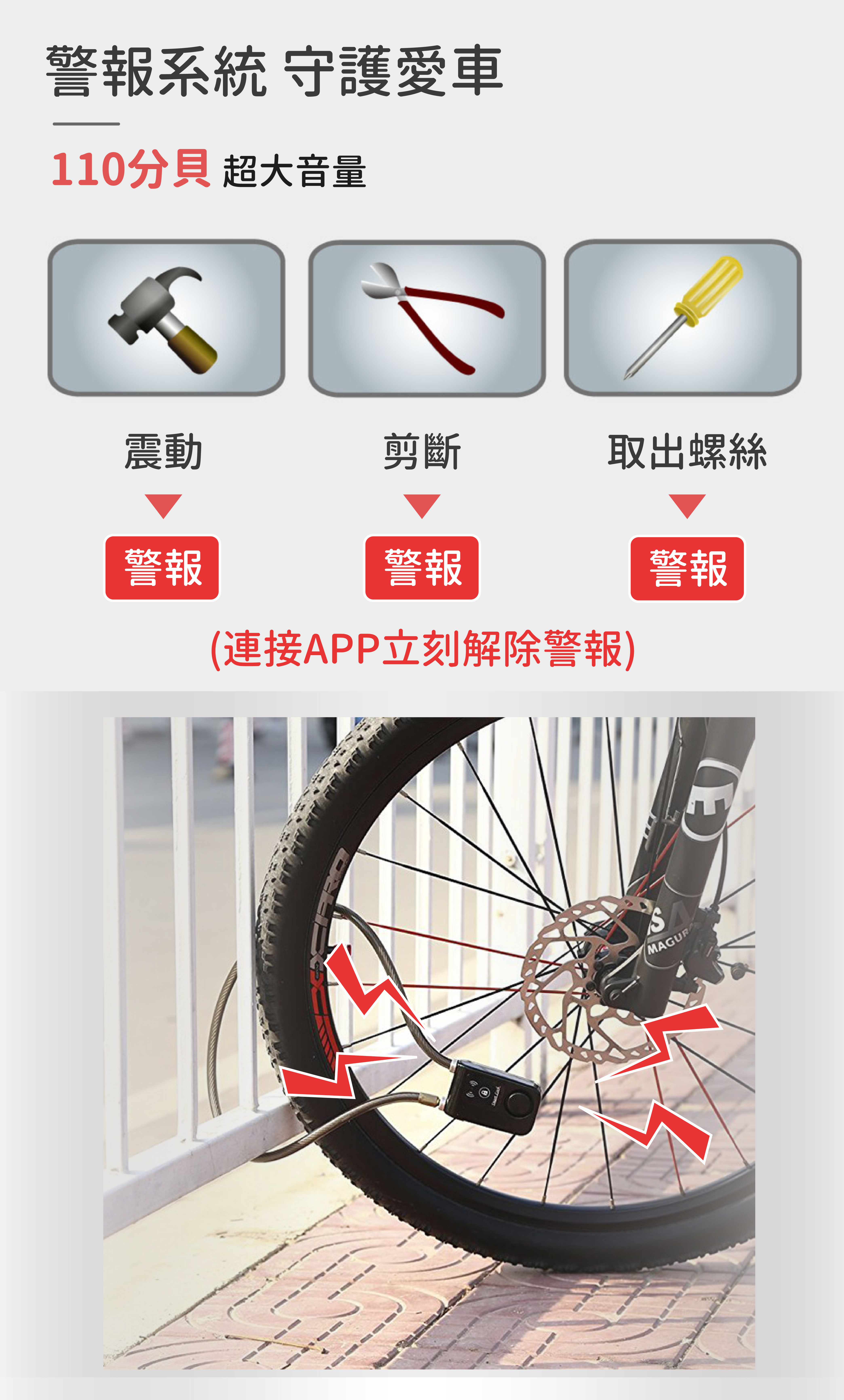 防剪警報:剪斷鋼纜,警報器將會響起,連接APP可立刻解除警報